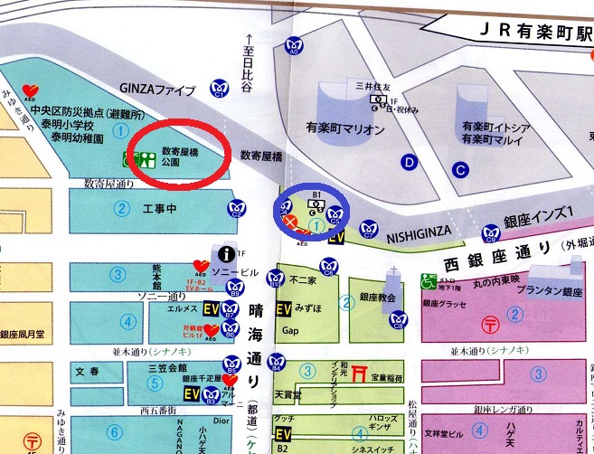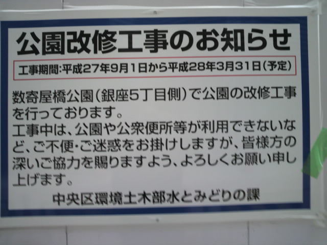 晴海通りをはさんで、南北に2ケ所、数寄屋橋公園がありますが、南側の公園が改修中です。
