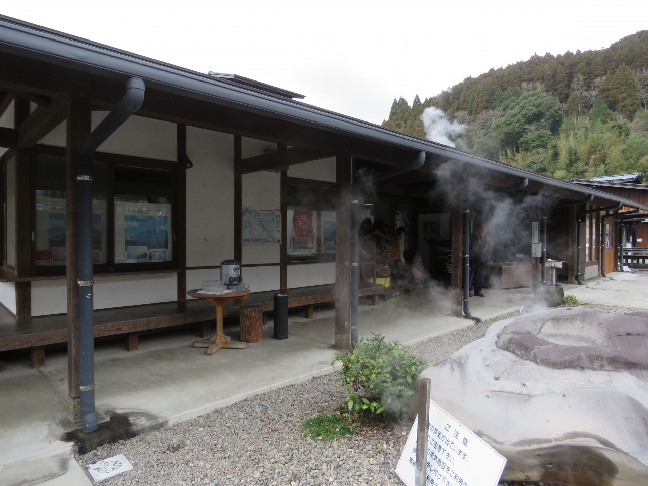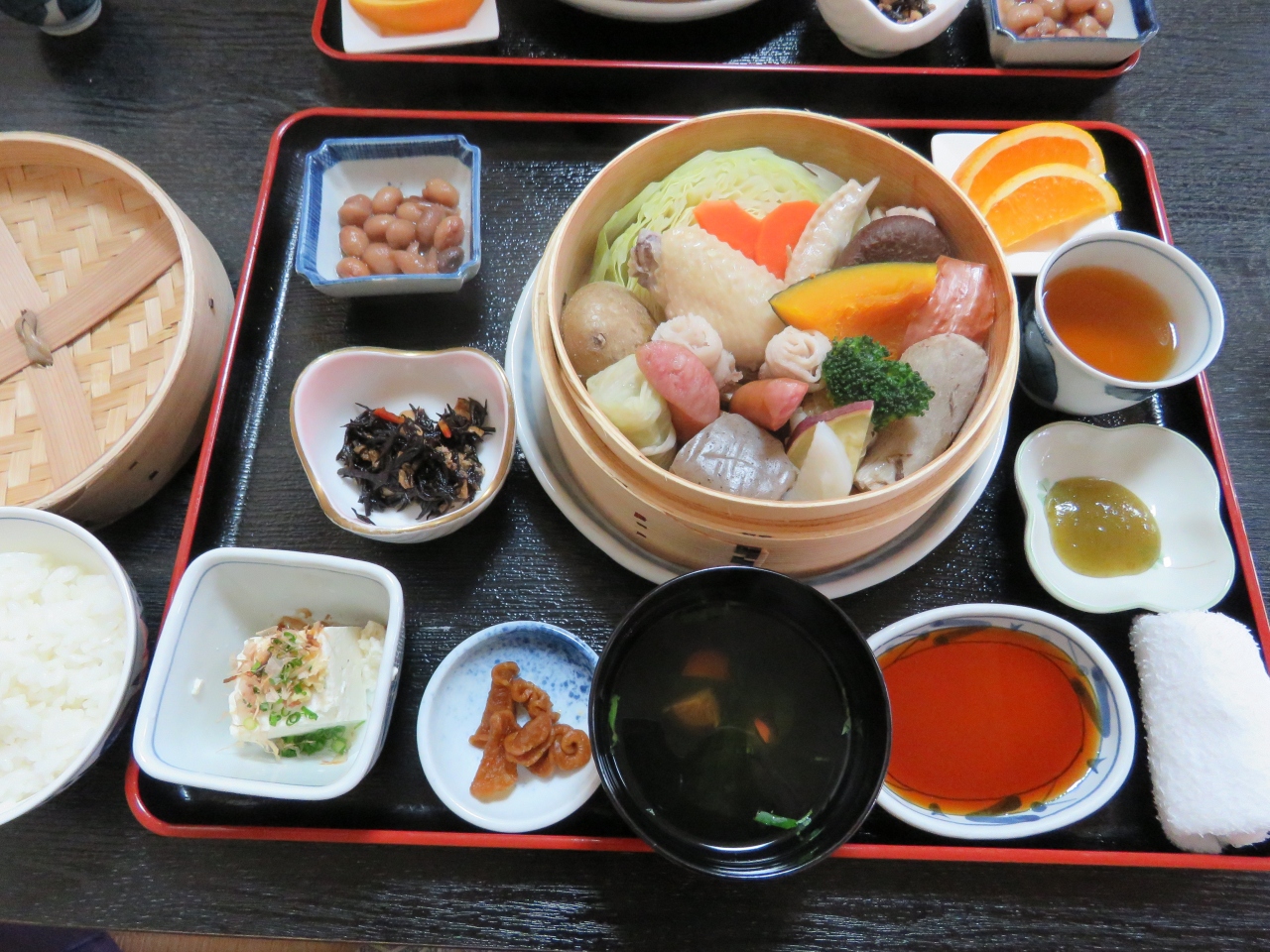 温泉の蒸気で蒸し上げた郷土料理「ゆけむり定食」@1400円を食べましたが、メイン=丸い蒸し器に手羽先鶏・豚肉や里芋・ジャガイモ・人参・玉ねぎ等野菜が入って、ヘルシーでおいしかったです。