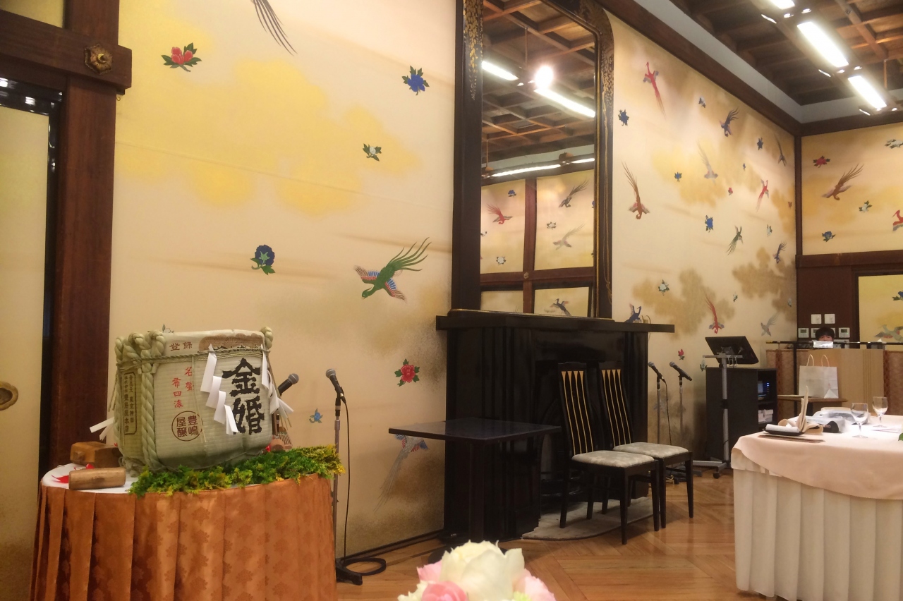 壁にはおめでたい金鶏と牡丹が描かれており、中央壁面には大鏡付きの和様の飾り暖炉がしつらえてあり、高い格天井からは素敵なシャンデリアが下がっています。