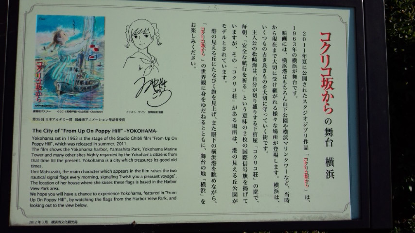 元町に散歩していたとき、偶然にこのスポットを見つけました。「コクリコ坂から」という映画が大好きですからうれしかったです。このスポットで国旗と案内ボードがあります。案内ボードで日本語と英語の説明が書いてあります。