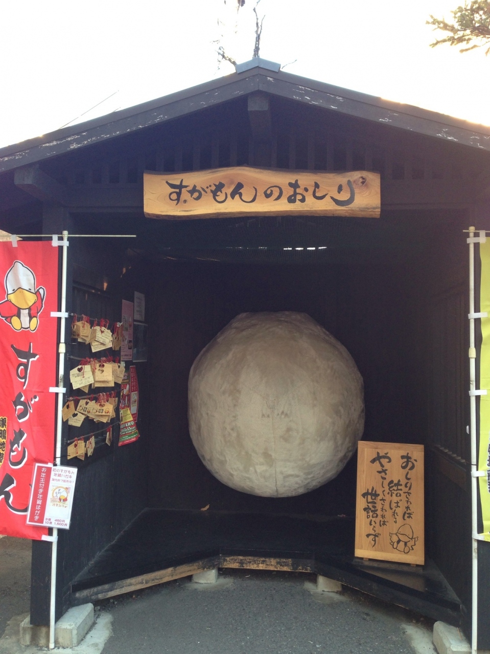すがもんのおしりは すがもんと同じファー生地で出来ていて気持ちの良い触り心地。さわるとご利益があるそうで、若い方中心に皆なでていました。絵馬もあり本格的。