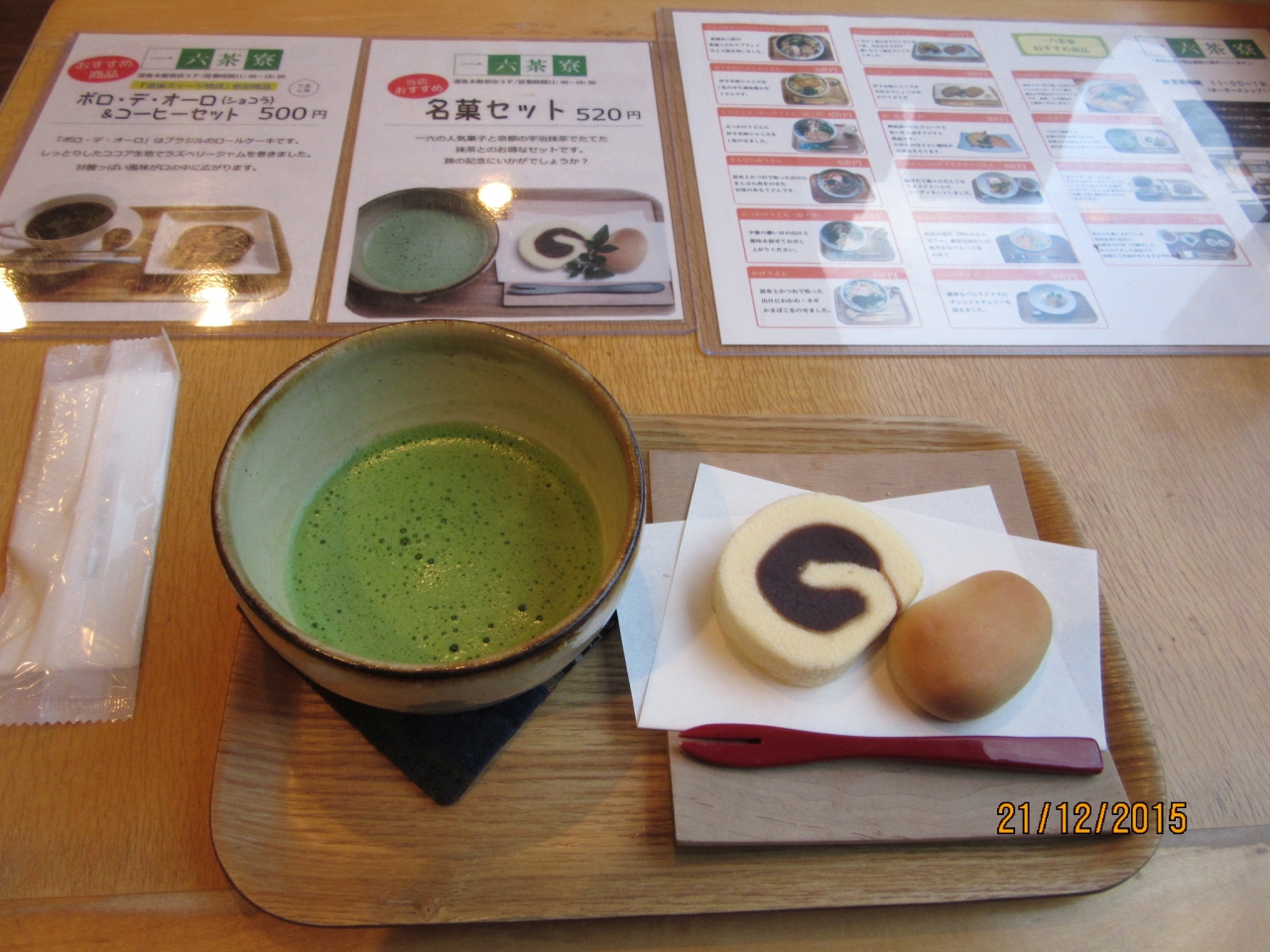 【一六タルトと抹茶セット520円】。スタッフが大変感じが良く、店が空いていたこともあるが、道後温泉の現状や将来、松山の観光スポットなどを、旅行雑誌や地図と共に親切に説明してくれて大いに参考になった。