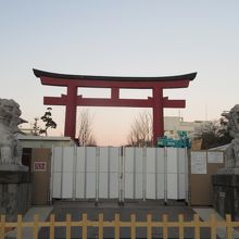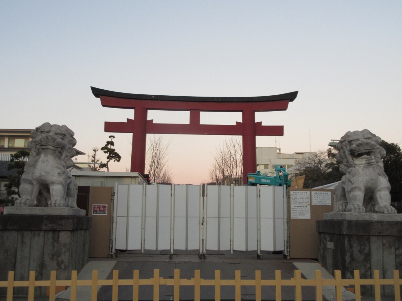 大きな朱色の鳥居の前に白色の狛犬がよく映えているが、なんせ段葛が整備工事中のため・・(涙)