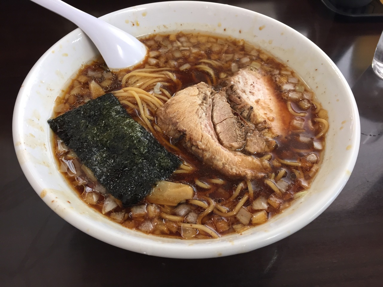 濃口醤油の富山ブラックラーメンと玉ねぎを刻んで入れる八王子ラーメンを掛け合わせたようなラーメンです。