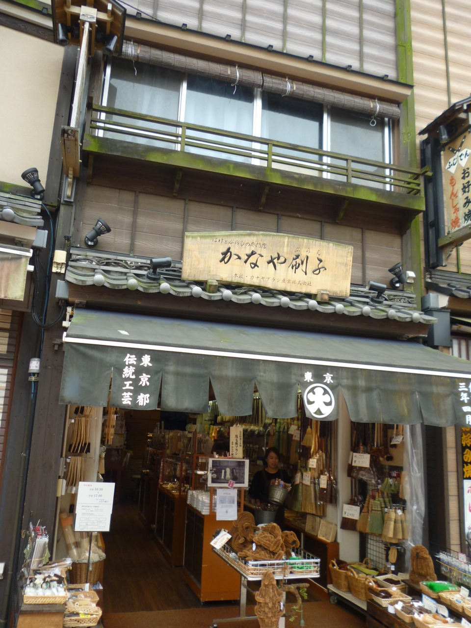 浅草仲見世通りに交差する、伝法院通りにあります。刷毛と、ブラシの専門店です。「100万人の歯ブラシ」が有名で、馬毛と豚毛で作られています。ボディーブラシや、職人さんが使う刷毛などもありました。伝統を守っているお店です。