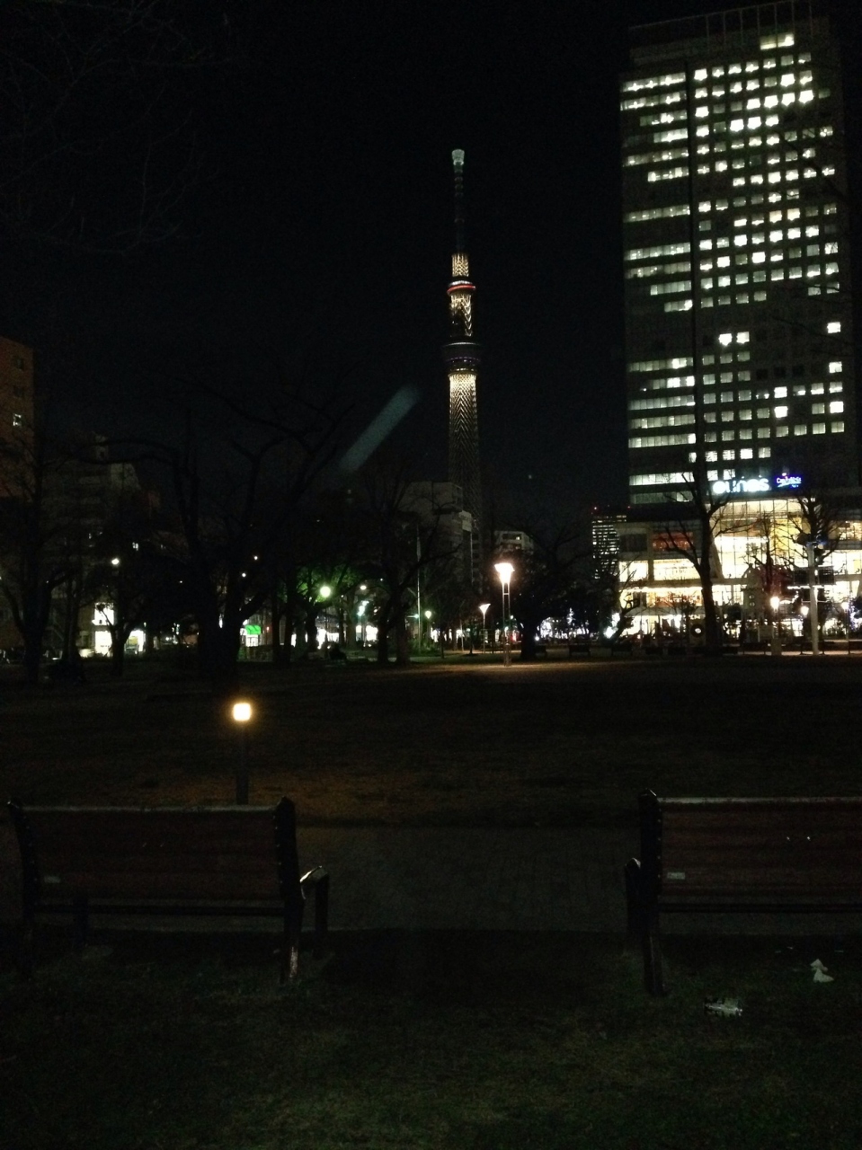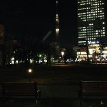 公園も広々としていてベンチでゆっくりできる雰囲気です。スカイツリーもよく見える!