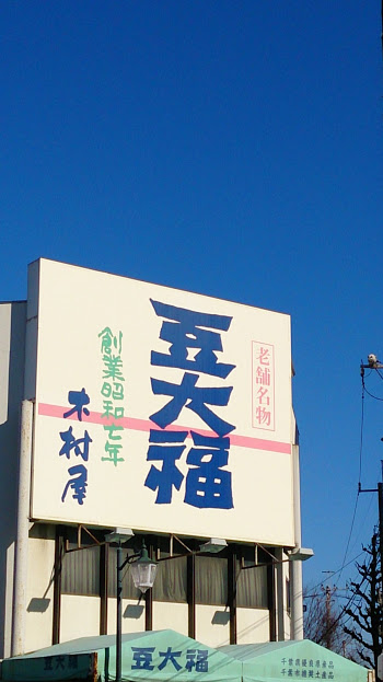 千葉神社のはす向かいにある和菓子屋さんで、店の壁面に巨大な看板が掲げられているのですぐにわかります。創業が昭和7年でこの界隈ではかなりの老舗のお店です。主力商品は豆大福で餅粉は使わずもち米のみの皮と餡は北海道産の小豆を使用、その日分の商品しか造らないなど、素材と製造にこだわったお店です。大粒の豆と絶妙な塩加減が一層こちらの豆大福をひき立てていると思います。名物豆大福以外にも羊羹などありますが、一にも二にも押しは豆大福です。