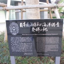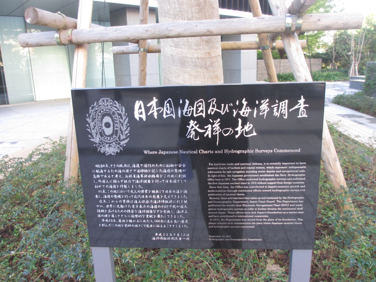 築地市場の近く、中央市場通りにある東京国税局の前の植栽の中に説明板があります。明治4年にこの地に兵部省海軍部水路局を創設し、独力で海洋調査を行って我が国初の海図を作成したそうです。業務を引き継いでいた海上保安庁海洋情報部が平成23年に築地を離れたのを契機に説明板が設置されたようです。
