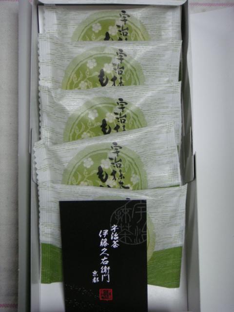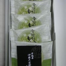 お土産用の宇治抹茶最中(6個入り)です。餡子の中に抹茶色の餅が入っており、食べるとモチモチした食感ですが、抹茶の風味はあまり感じられず普通の最中の風味です。最中の皮の部分は始めはサクっとしていますが、賞味期限が近くなるにつれてサクサク感が無くなりますので、お早めに召し上がったほうがよいです。