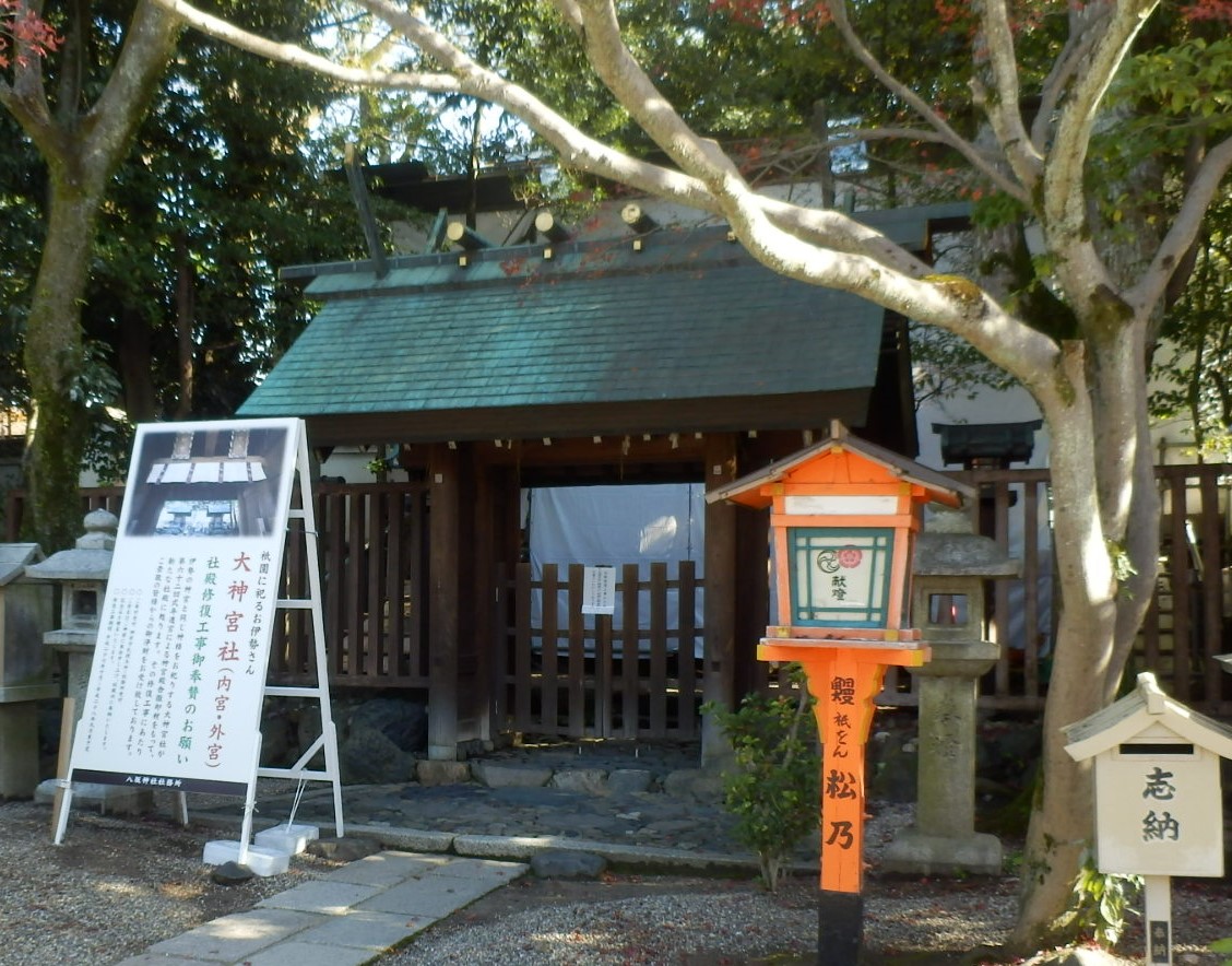 京都の八坂神社は一般的に祇園さんと呼ばれて親しまれています、大神宮社は八坂神社の境内内の末社で、伊勢神宮の天照大御神(内宮)と豊受大神(外宮)をお祀りしている、本殿の裏側に当たる参道沿いに鎮座されています、参考資料**現地設置の説明用立札