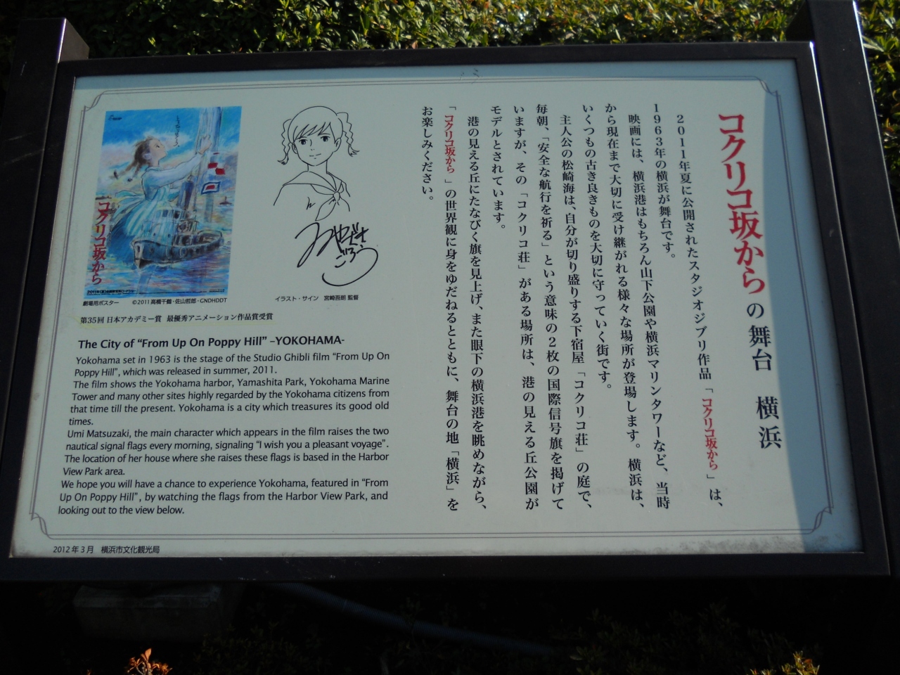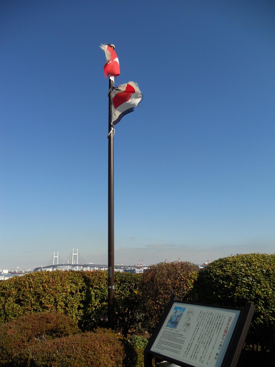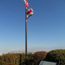 「港の見える丘公園」の展望台の近く(向かって少し右手)にある、アニメ映画「コクリコ坂から」の街並みや情景が横浜をイメージして描かれていることから、こちらが記念の地になっているようです。素敵な旗が建っていて、とても雰囲気が良かったです。