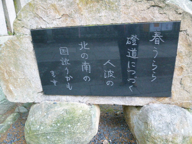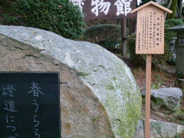 今日は香川県琴平にある「金刀比羅宮」にきています。頂上の本宮まで登りますよ。やっとここは中間地点くらいです。先ほど堂々とした総門である大門を通って、ここ「琴陵光重歌碑 」にきました。「宝物館」への看板がありますのですぐわかりますよ。平成11年建立の「春うらら磴道につづく人波の北の南の国訛りかも」の歌碑です。小林一茶の句碑もありますので一緒に御覧なってくださいね。さぁー階段はまだまだ続きます。