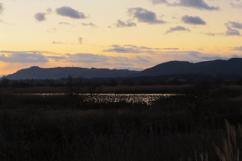 蕪栗沼は宮城県大崎市にある沼で、冬は白鳥やガンなどの渡り鳥の楽園として有名です。国指定鳥獣保護区特別保護地区指定。2005年11月にラムサール条約登録湿地となったそうです。
