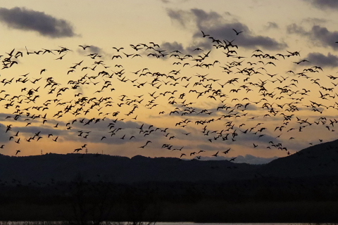 - 朝のマガンの一斉飛び立ちは迫力満点
