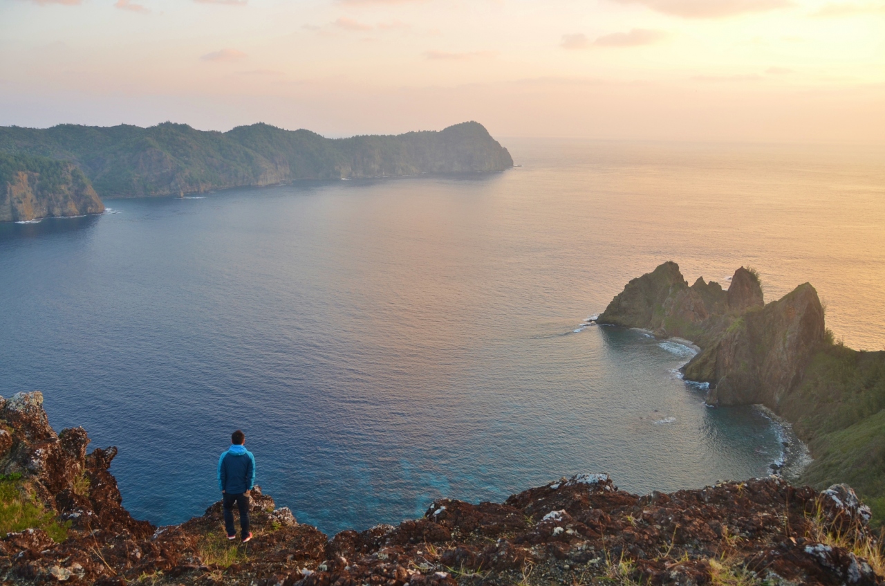 海は南国の青。でも沖はオレンジに焼け・・・。