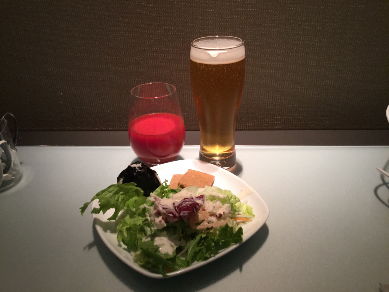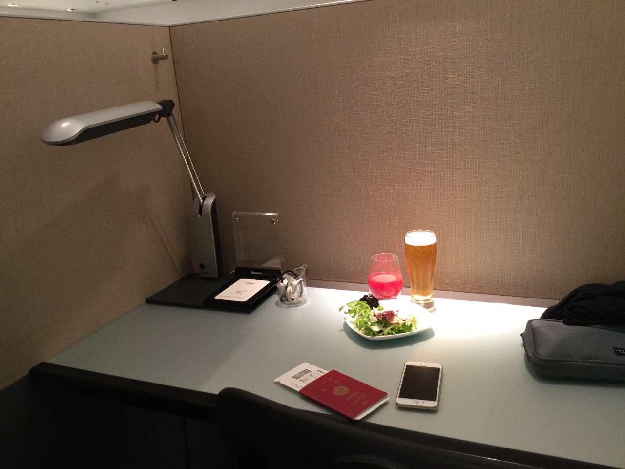 シンガポール行きに搭乗する前に寄りました。夕方だったので出発便が多かったせいかラウンジ内にはかなり人がいましたが、奥のほうにあるデスク付きの個室っぽいスペースの所は人が少なかったです。この場所はこんせんとも一箇所と携帯の充電器があったので個人的には気に入った場所です。このラウンジはゲートの端にあるので、搭乗ゲートまでの移動が面倒です。あとラウンジから外が見えないので、飛行機を見たい方には残念かも。