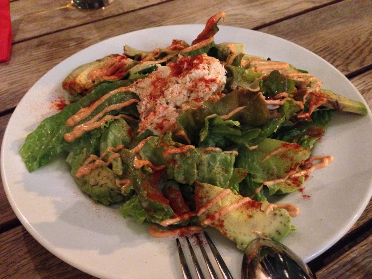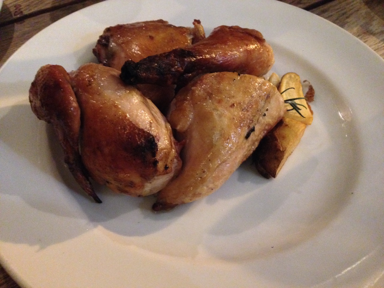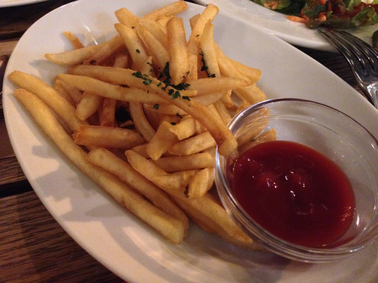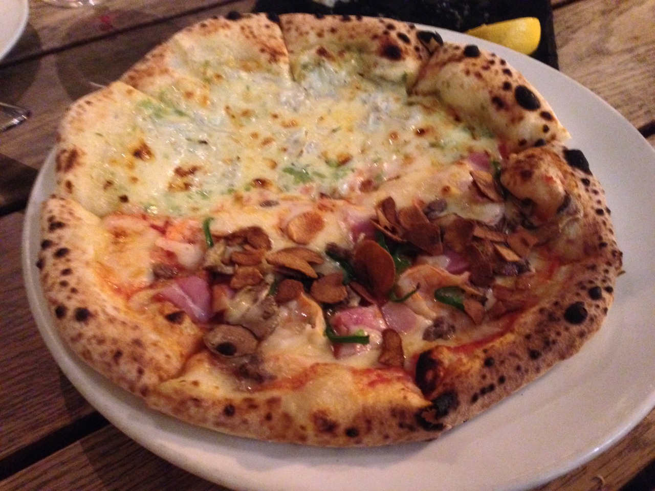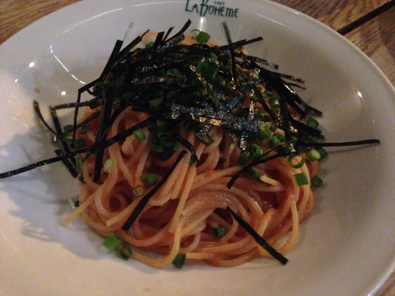 カルパッチョ、サラダ、フレンチポテト、ヤリイカの唐揚げ、若鶏のローストなどの単品ものをビールやワインで美味しく味わいます。最後に、ハーフアンドハーフのピザや辛子明太子のスパゲッティを頼んでお腹いっぱい。ガラス張りで御苑の景色も良く、満足なイタリアンでした。