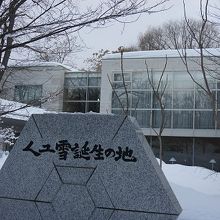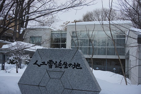 北海道大学の クラーク会館から構内の道路を北へ300mほど 進むと, 総合博物館の先の“ファカルティハウス・エンレイソウ”の玄関前東側に, 六角形 の白御影石の石碑が建っています。この地は、昭和10年10月、「常時低温研究室」が建てられた場所です。翌年3月、ここで理学部物理学科、中谷宇吉郎先生がはじめて人工の雪の結晶を作るのに成功しました。