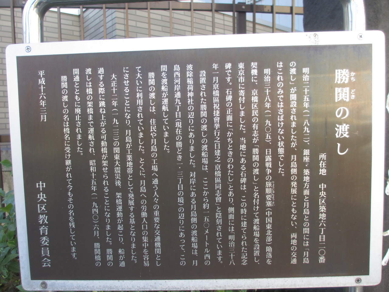 勝鬨橋の銀座よりのたもとにある、かちどき橋の資料館の前に碑と説明板があります。明治38年に区民の有志が渡船場を設置し東京市に寄付した際の記念碑だそうです。昔は船で渡っていたのは今の様子からは想像もつきませんでした。