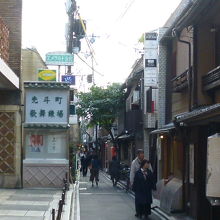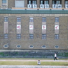 鴨川沿いを沿うように四条通から三条通へ続く細長い路地が続く先斗町。その一角にあるのが先斗町歌舞練場です。どちらかというと三条通からの方が近く鴨川縁からでも外観がご覧いただけます。大正時代の大阪松竹や昭和初期の東京劇場などを手掛けた建築家・木村得三郎によるもので.先斗町歌舞練場も昭和初期に建てられたものです。鉄筋4階建、特徴的なのが表面に小さな窪みを付けて焼き上げたタイルの表面に釉薬(うわぐすり)が施されているスクラッチタイルを使用していて焼きの素材感を感じることができます。館内では花街の舞妓さんや芸妓さんの舞踊公演などが開催され代表的な鴨川おどりがあります。