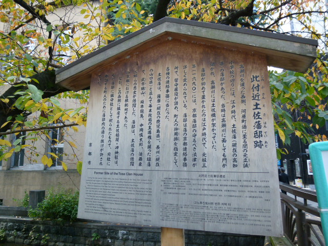高瀬川沿いを沿うように続く木屋町通を散策、幕末を駆け抜けた新撰組の志士たちの隠れ家などがあったり、暗殺の場や居住していた事を標す碑が数多く立っています。土佐藩邸跡は木屋町通周辺の現在の旧立誠小学校一帯のことのようで、坂本龍馬をはじめ、多くの土佐藩士たちが出入りしていたようです。遠い昔の時代に思いを馳せてみるのも良いものですね。