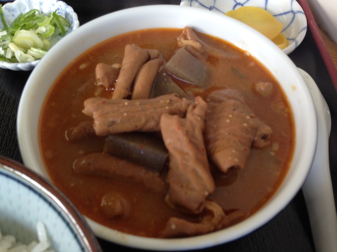 トラックの運転手さんご用達のもつ煮込み屋さんとして有名です。昼時で20人くらい並んでいました。店内は狭いのでカウンターにお盆を載せるときは縦にしないといけないそうです。豚もつとこんにゃくのみのシンプルなもつ煮で、ピリ辛味のおかげで臭みはありません。ご飯は普通盛りでも多いので注意。