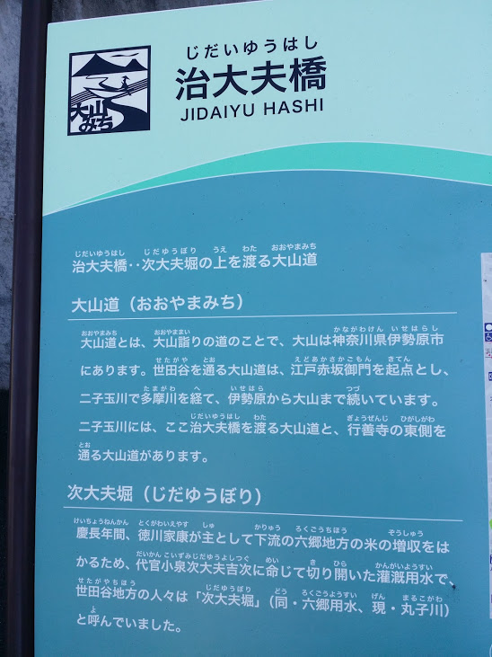 東急田園都市線の二子玉川駅から歩いて10分ほど、旧大山街道を用賀方面に行くとある昔から続く橋です。徳川家康の命令で、お米の増産を目指すために灌漑用水が作られ、そこにかけられた橋の名残が残っています。そのわきに説明の文章があります。