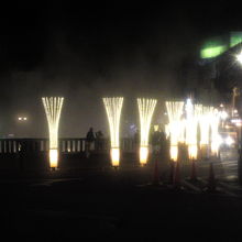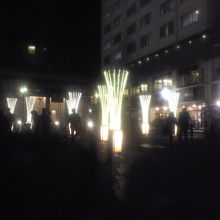 美しくライトアップされた湯畑からは