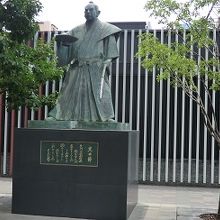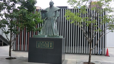 博多口広場の一角に左手に名槍「日本号」右手には大杯を持った黒田武士の像が立っています。軍師・官兵衛の家臣・母里太兵衛が、盃に注がれた酒を飲み干し、天下の名槍“日本号”を酒で飲み取ったというエピソードが黒田節の由来といわれています。NHK大河では、モコミチが母里太兵衛の役を演じていましたね。