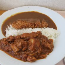 今回オーダーしたのは、ゲレ食バトル出品メニューである、ALPS360デラックスカレーで、「バターチキンカレー」と地元の白馬豚ではなく「三元豚カツカレー」のハイブリッドカレーで、なかなか美味しかった。が、かなり不満。
