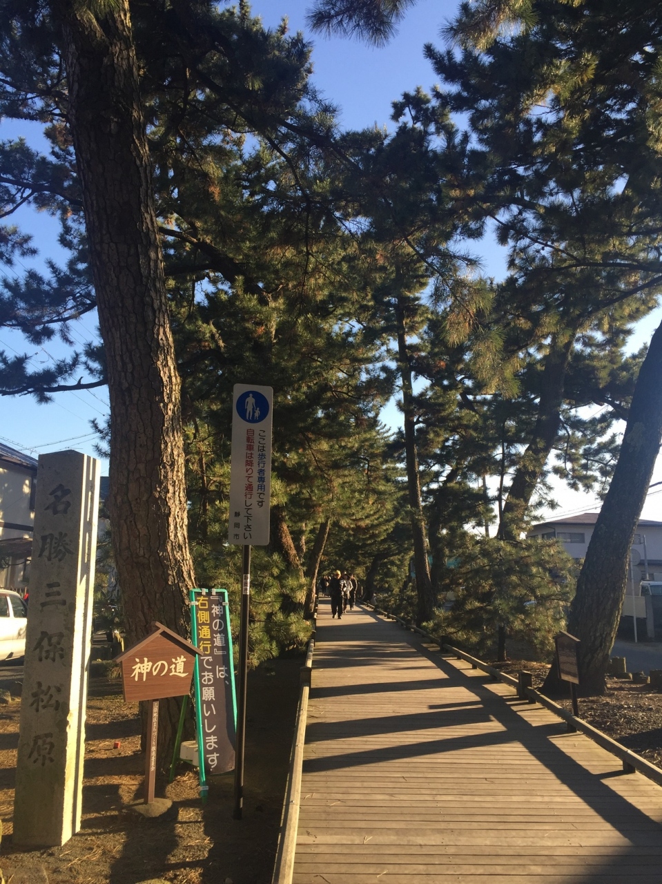 我々観光客はバスで三保の松原に到着すると 御穂神社にお参りし この道を通って 三保の松原に向かうが。