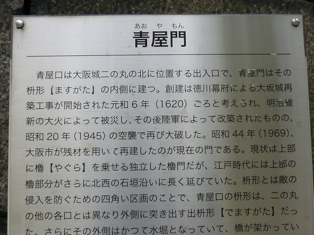 今日は大阪城を散策します。大阪で最も有名な観光地でもあり、とにかく広いです。その大阪城への入口は数か所ありますが、ここは「青屋門」となります。方角から言うと北東方向でちょうど大阪城ホール付近からの入口です。1620年頃の創建で、数回の復元により1970年に今の姿になっています。この外堀を超え橋を渡り門の中に入ると現在の大阪城らしい景色となりますね。右は極楽橋、左は梅林方面となります。
