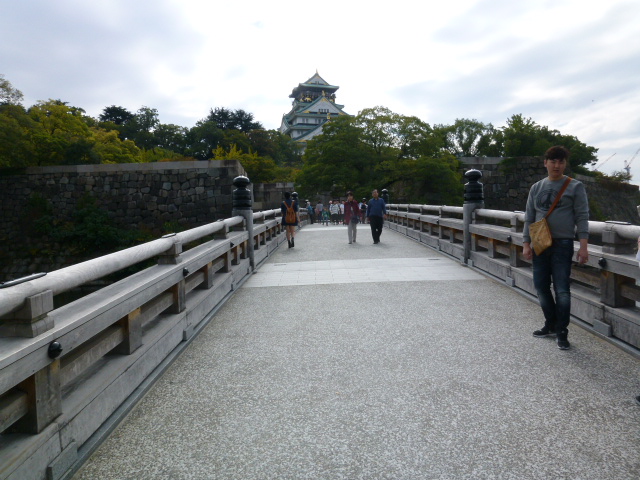 今日は大阪城を散策します。大阪で最も有名な観光地でもあり、とにかく広いです。その大阪城への入口は数か所あります。ここは二の丸と山里丸をむすぶ橋で、内堀を超え中に入るようになります。1626年に創建され、もとは木造だったらしいのですが、1965年に現在の鉄筋コンクリート造りになったとのことです。さぁー中に入って大阪城の姿を堪能しましょう。
