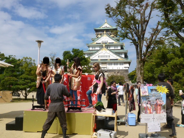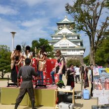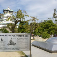 広ーい大阪城公園の本丸にやってきました。ここからは目の前にある天守閣が大きく見えます。本丸とは城の中心部を言い、天守閣のほか活動の中心となる本丸御殿もあったようですが、今は「タイムカプセル EXPO'70」やお土産屋さんなどがあり、特に海外からの観光客で賑わっています。