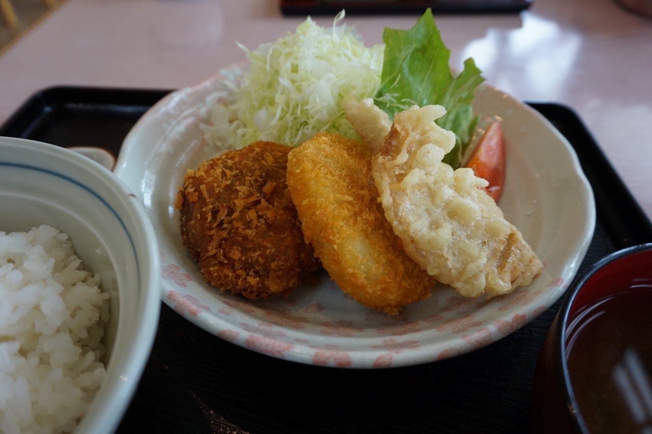 この辺の名物料理を食べたくて探していると見つけました。イノシシ料理。鍋やどんぶりメンチなどがあり、私はイノシシのメンチとコロッケ(普通の)筍の天麩羅のフライ定食にしました。初めて食べるイノシシは思ったほど臭みもなく食べることが出来ました。