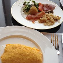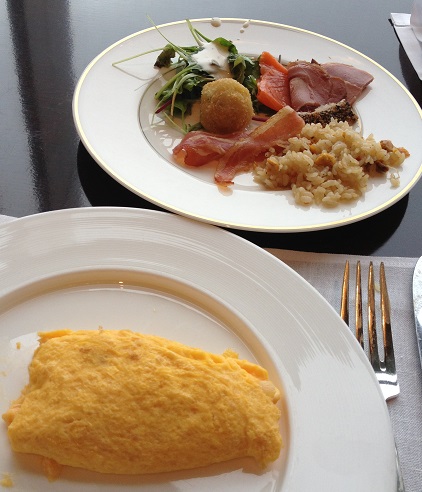 45Fのすばらしい眺めを見ながら優雅に食事をすることができます。オムレツをシェフが作っていくれたのですが、少し火加減が弱く、もう少し固めでふわふわだったら良かったなと思いました。でもサラダ、ハム、チーズ、パンはどれも質が高くておいしかったです。