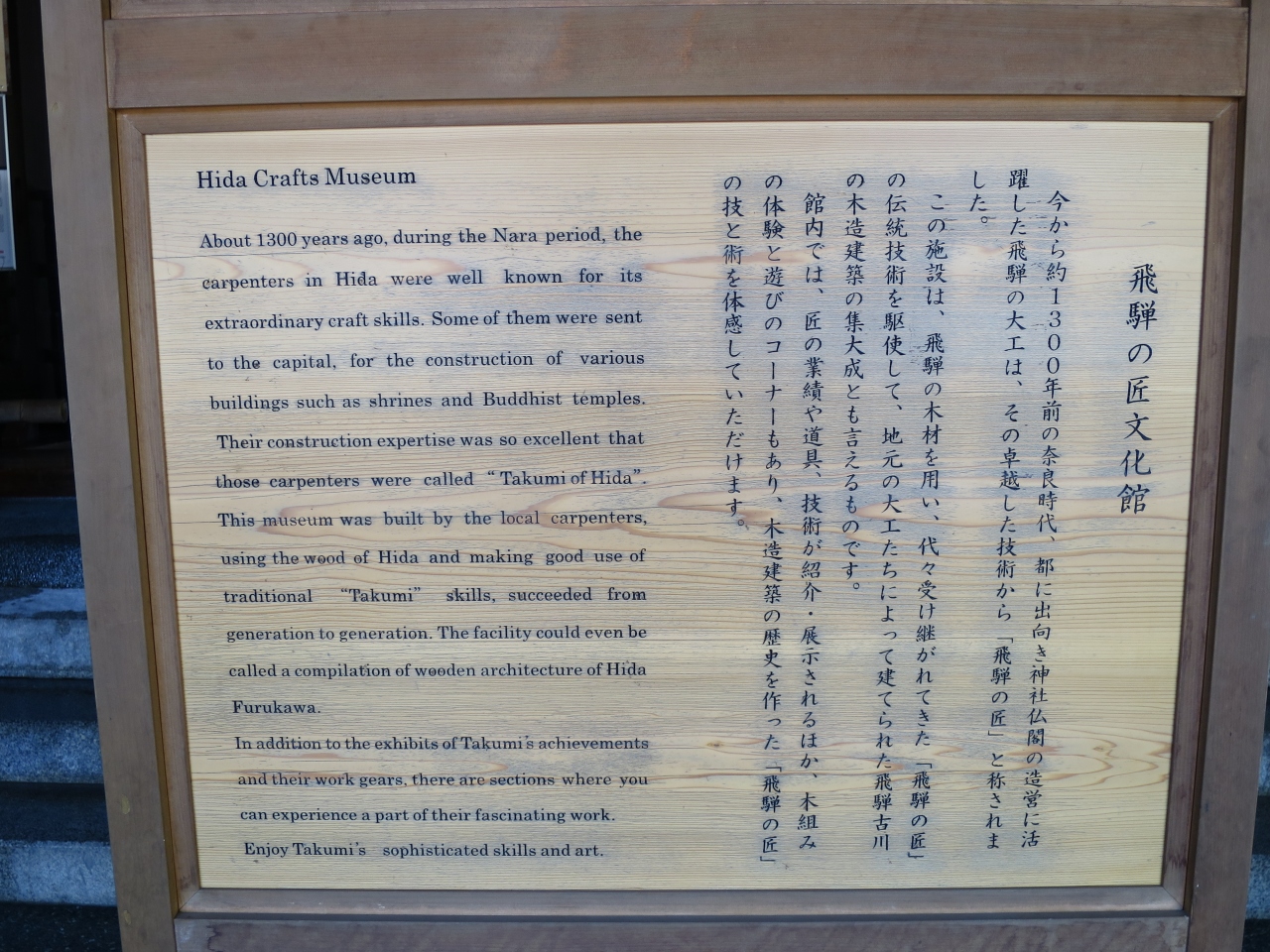 飛騨の国で育まれた伝統の職人技である飛騨の匠がつくる木工技巧を展示、体験できる施設です。ここの建物も伝統の技術が使われ、釘は一本も使われていないそうです。千鳥格子や様々な継手はどのように作られているのか考えると、まるでクイズの様です。