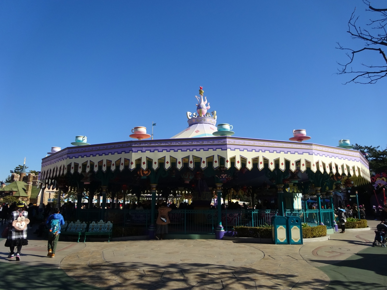 お誕生にではない日を祝う乗り物です。ティーカップが動くスピードもそこそこ速く、中央の部分を強く回せば絶叫系に匹敵します…。小さいお子様がいる家族が並ぶので、そこそこの待ち時間になりますが、比較的夜は空いていることが多いです。イルミネーションが綺麗です。
