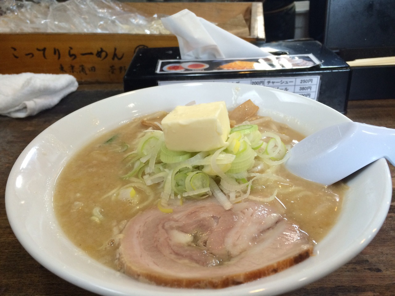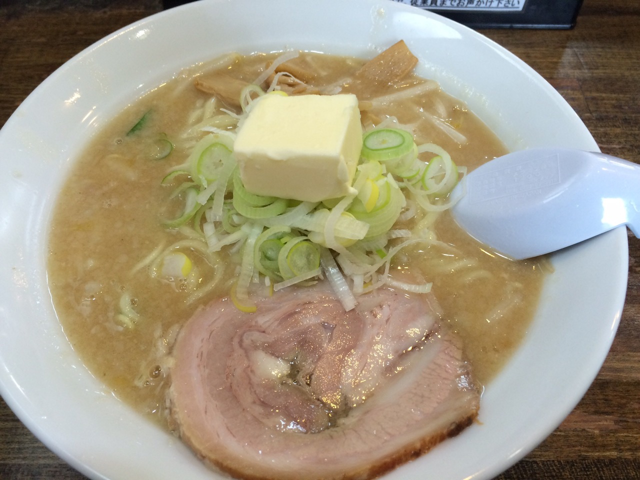 店内入ると自動販売機があります。カウンター10席のみの狭い店内です。16時に訪問したので、バター、たまご、大盛りのいずれかのトッピングは無料です。バター結構大きかったです。スープは味噌の加減がちょうど良く麺に絡みも良いです。