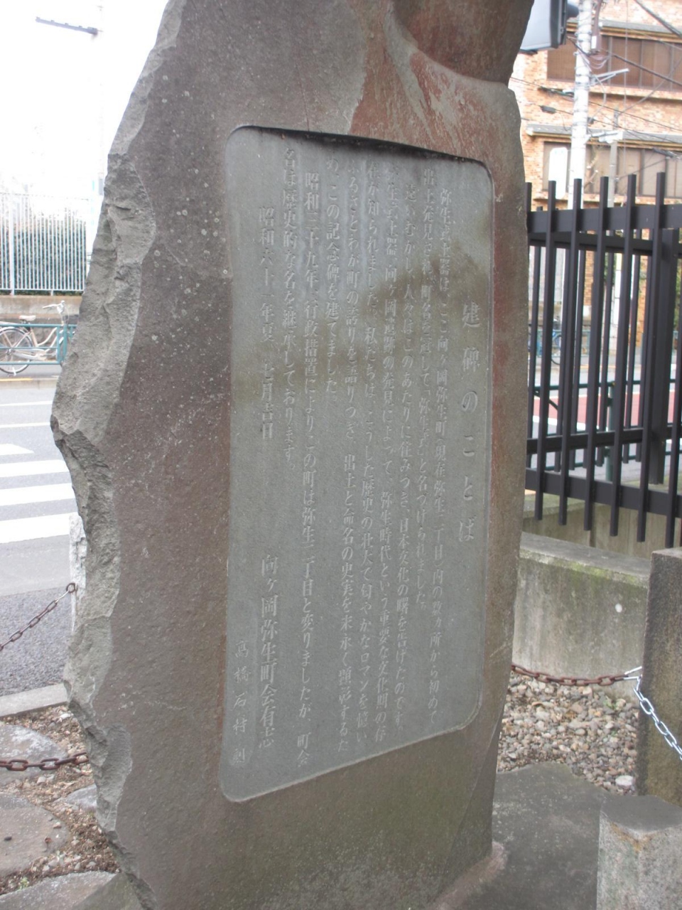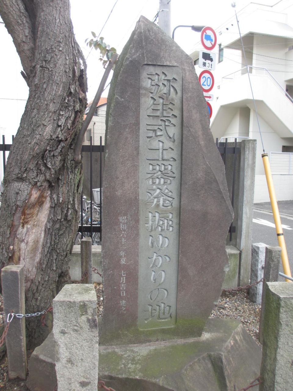 言問通り沿いにあります。場所は、根津駅を出て東京大学浅野キャンパスを左手に見ながら進むとキャンパスの端あたりにあります。読みにくいですが、碑の裏面に説明文がありますのでご注意ください。所のあたりは弥生時代から人が住んでいたのですね。