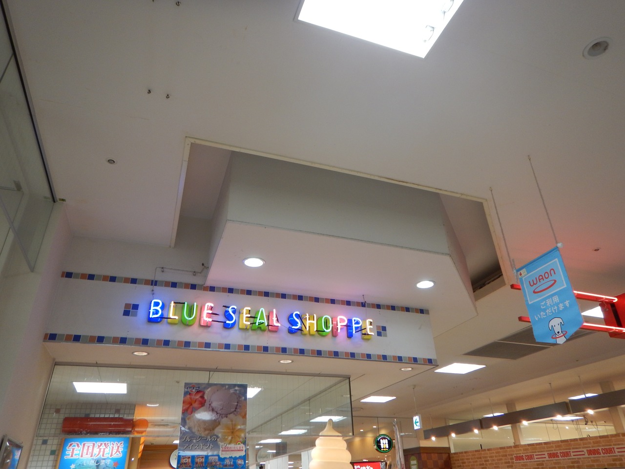 イオン那覇店 1階のフードコートの中にあります。サービスカウンターの通路を挟んで向かい側になります。BLUE SEAL SHOPPE のSHOPPE が気になったので調べてみたら、SHOPの古い形で、古風な感じを出すために店名などに用いられるそうです。沖縄県内ではあちこちにあるブルーシールショップですが、午後3時ごろ行ったので、制服の学生さん達でにぎわっていました。