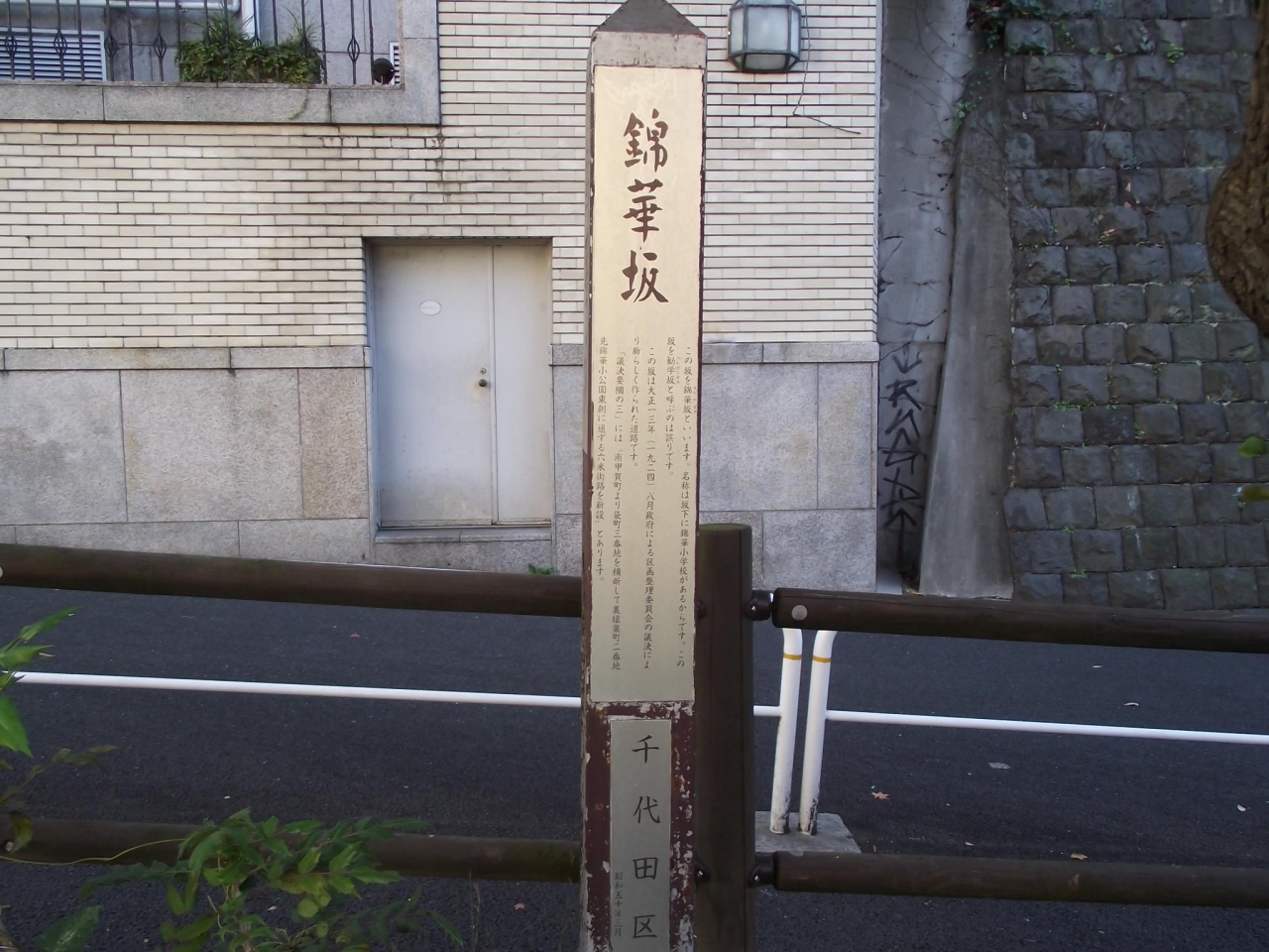 その坂を南側に下る途中が錦華公園だが、公園に入るところに坂の名称などが書かれた柱が立ててあった。
