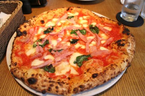 ニセコの有名ピッツァテリア『デルソーレ』に行って来ました。完全予約制のお店で、私も1週間前に予約を入れておきました。ニセコのペンション村の中にある、こじんまりしたお店なんですが、シェフはナポリ帰りだそうです。私は、『マルゲリータ』を!どのお店でも、ナポリピザ屋さんで食べるのは、マルゲリータのみと決めております。素材のシンプルさが、却って美味しさを際立たせている気がします。主人は、『マルゲリータのハムのせ』をオーダー。これも、ハムの塩気とトマトの甘さのバランスが抜群でした。