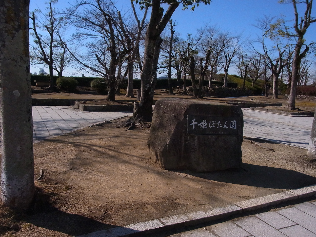 千姫ぼたん園は大手門を過ぎてお城へ向かう途中、左手の階段を上がるとあります。
