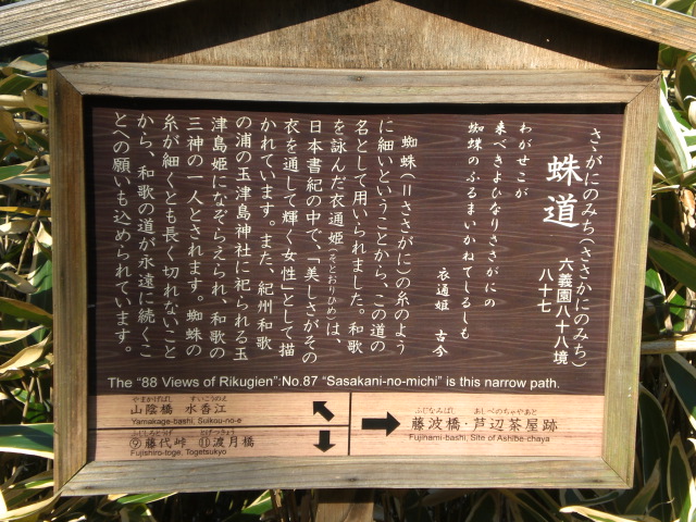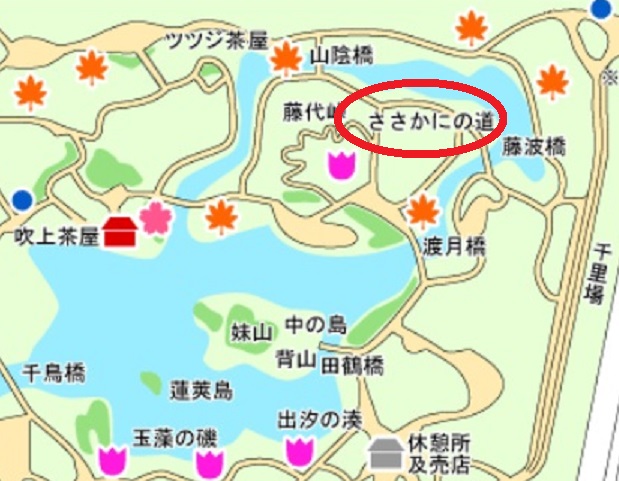 古今和歌集に詠まれた蜘蛛(ささかに)の道は、六義園の北側にあります。