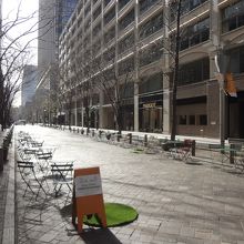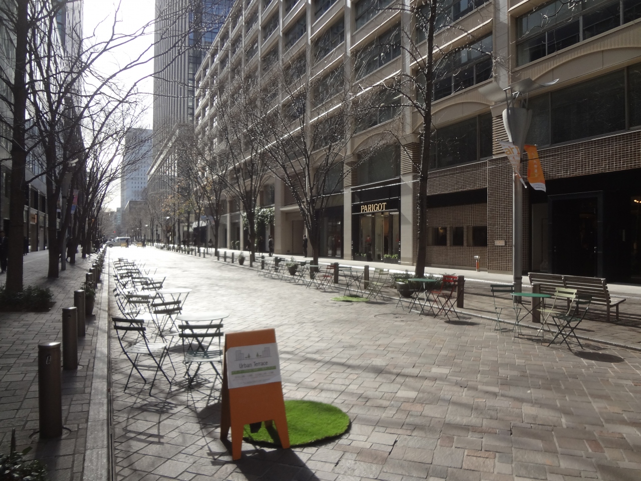 有楽町から東京まで続く丸の内仲通りです。時期にもよりますがイルミネーションでも有名です。日中の11時から15時まで歩行者天国となりアーバンテラスなるスペースが出現します。道路にテーブルと椅子が設置され、だれでも自由に利用できるようになっています。近隣にはテイクアウト出来るお店もあるので、ここで食べたりすることができます。ただ冬は寒いのでさすがに空いていました。