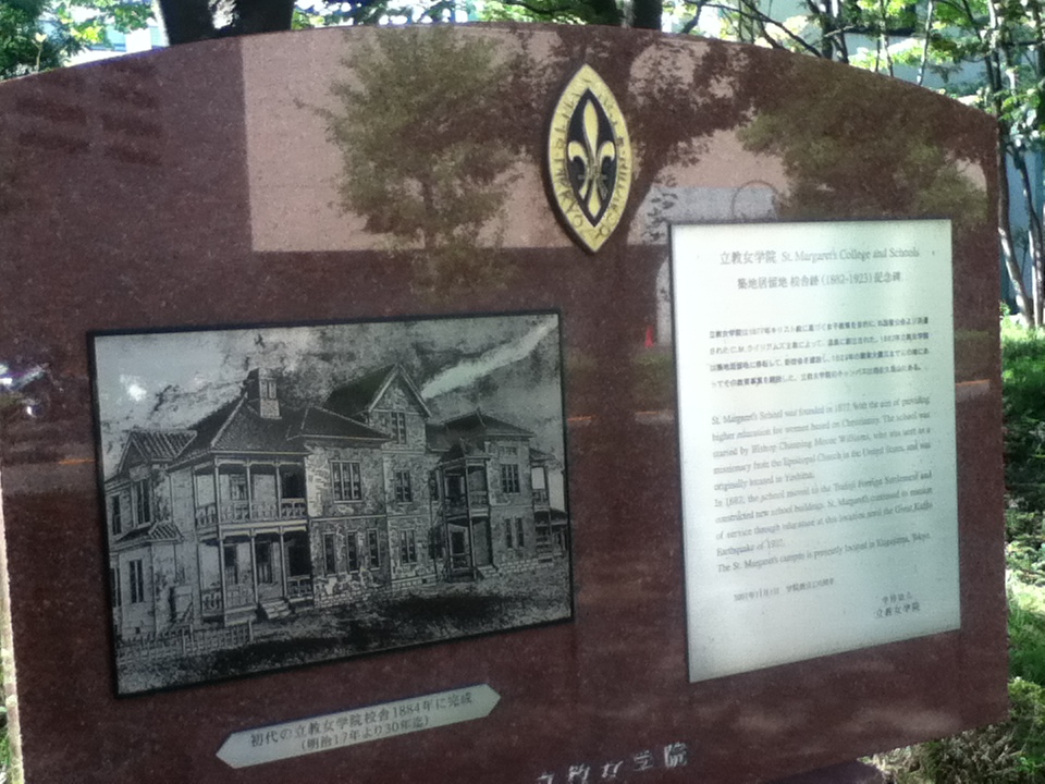 地下鉄築地駅の東側、聖路加国際大学東側の処にこちらの記念碑がある。週末午後、人が行き来していたが、こちらの記念碑を見る人はいなかった。記念碑はやや大きく、昔の校舎の写真とともにわかりやすく解説されている。立教女学院は1877年湯島に創立され、その後、築地居留地に移転し新校舎を建設した。立教女学院やこの界隈に関心や知識のある方は、訪問するのもいいかもしれない。