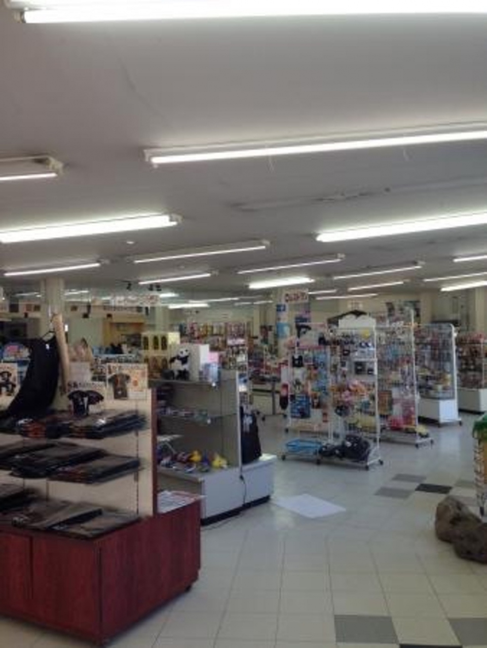 鹿児島や桜島と印刷された包装紙に包まれたお菓子、キーホルダーなどの雑貨、木彫りの民芸品。