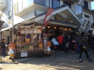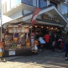 錦帯橋をお城のある側に渡って土手を降りたところにあります。隣同士にむさしと小次郎のお店が並んでいて、ソフトクリームだけではなく、コロッケや岩国土産などもありました。店の前には人力車もあり乗せてもらえるようでした。