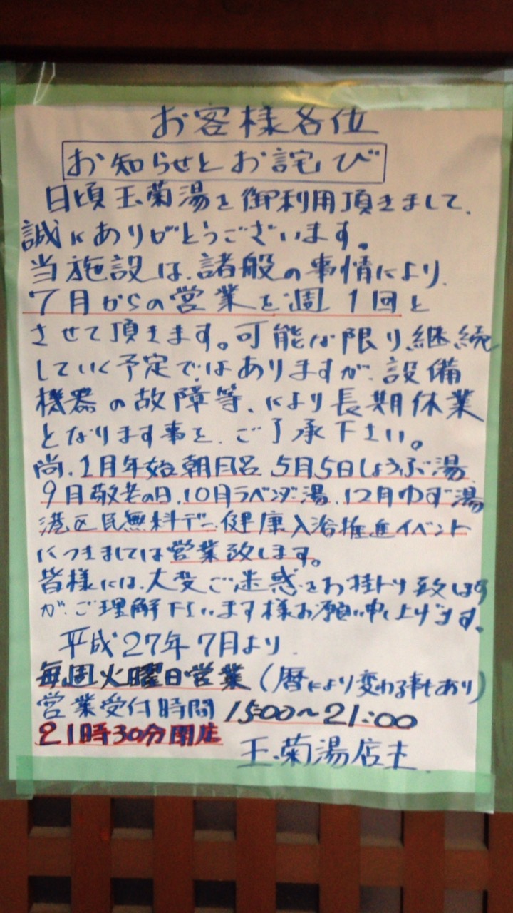 白金高輪駅からちょっと歩いたところにある銭湯がここ「白金温泉 玉菊湯」。ここは、最近、火曜のみの営業している温泉銭湯で、白金の商店街にあり薬局隣のマンション1Fにある温泉銭湯です。2015年7月からは、週1回、火曜のみの営業となっています。今回は、たまたま、知らずに火曜だったのがluckyでした。ここは、東京に多い黒い湯で、湯船は44度くらいの湯温。銭湯ということなので460円でリーズナブルで温泉満喫できました。